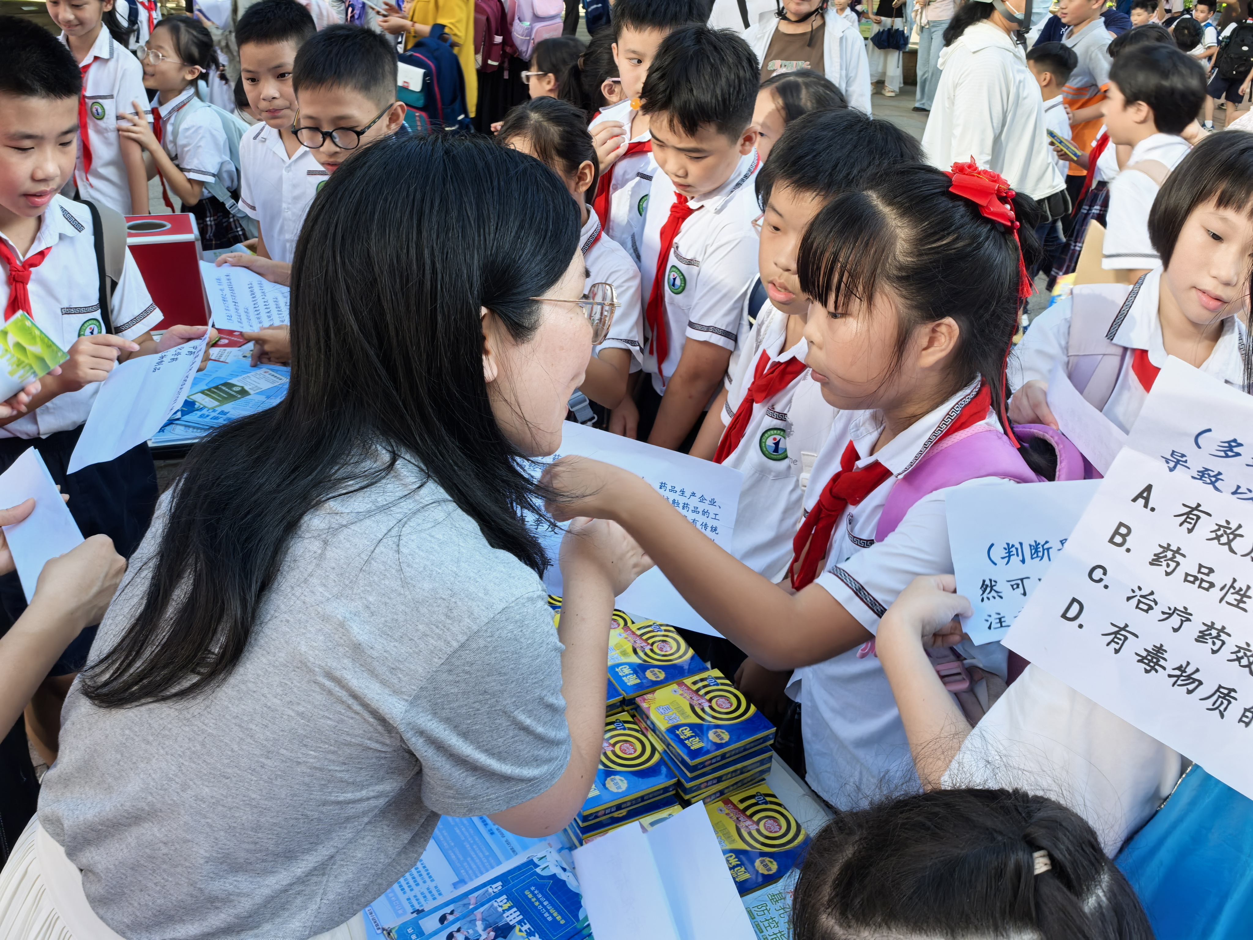 9月1日,在湛江市经开区第一小学门前,湛江公司携手泉庄街道人民社区党委开展药品安全进社区及及基孔肯雅热防疫志愿活动。活动现场设置了“咨询服务”、“有奖问答”环节,正值开学第一天,活动现场许多家长和孩子一同积极参与到答题活动中,以此契机为同学们上了关于用药安全科普的“开学第一课”。