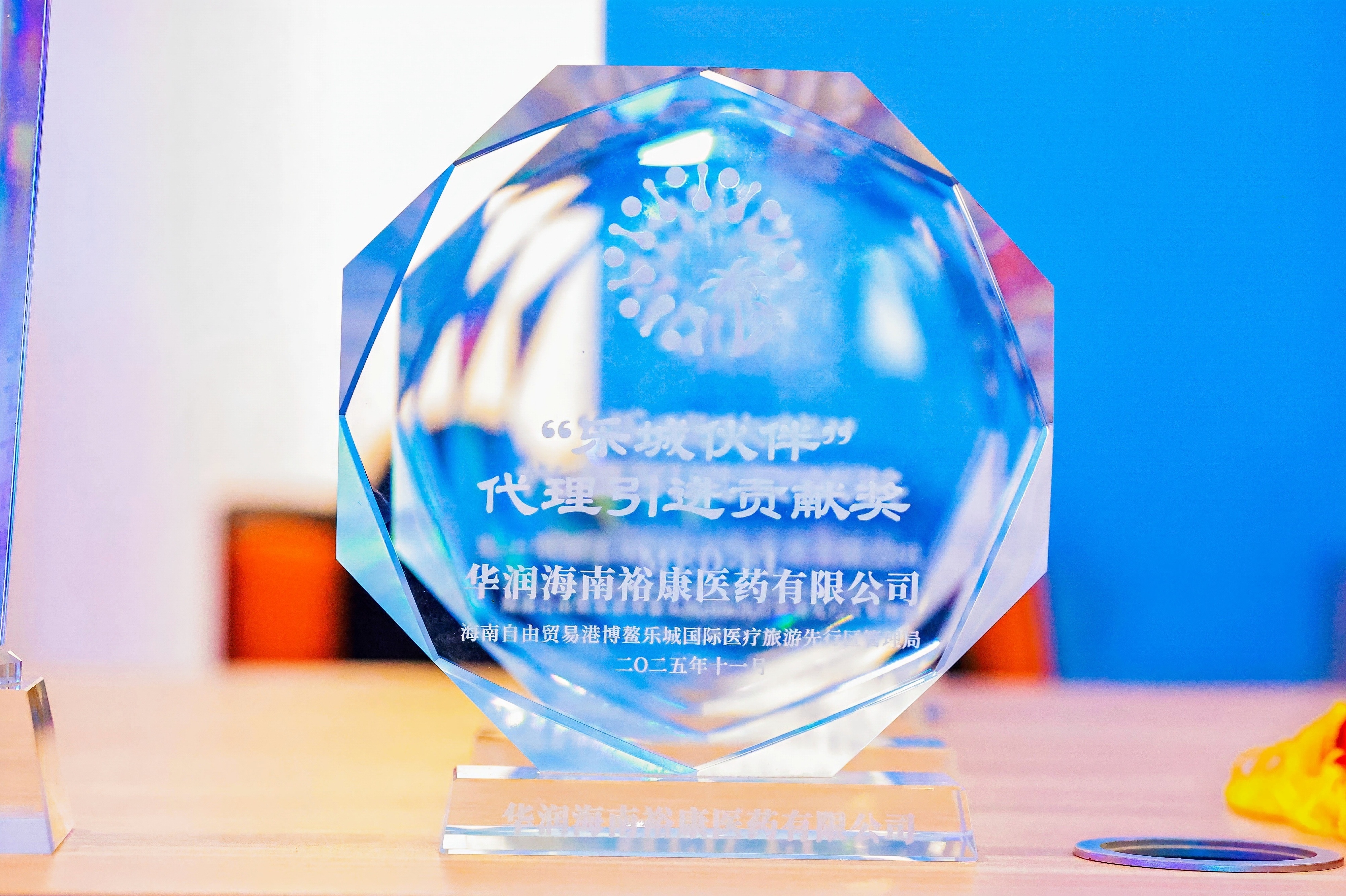 11月21日,在海南博鳌乐城首届全球创新药械博览会上,华润海南裕康医药有限公司荣获由海南自由贸易港博鳌乐城国际医疗旅游先行区管理局颁发的“乐城伙伴”代理引进贡献奖。