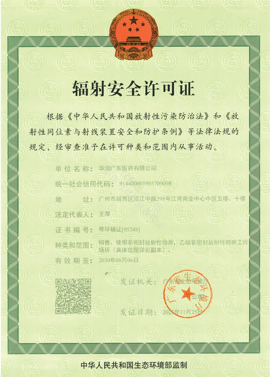 8月7日,华润广东医药首次取得辐射安全许可证;11月25日华润广东医药完成核素种类与数量的增项许可。现阶段,华润广东医药已构建起涵盖镥-177、钇-90、碘-125等10种放射性核素的合规经营体系。这张许可证不仅是公司合法经营的“准入凭证”,更是响应国家战略、践行环境健康安全使命的“责任状”。
