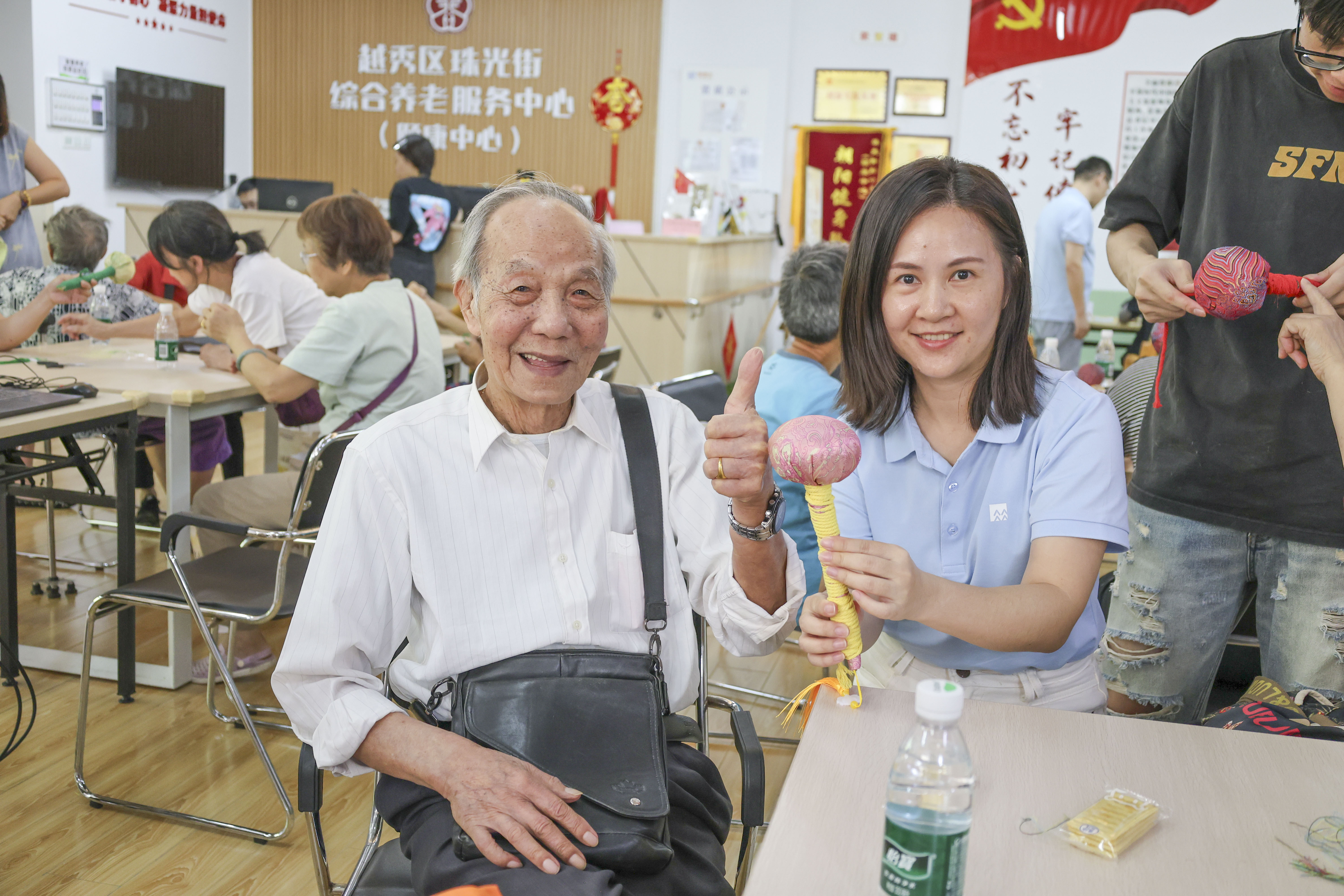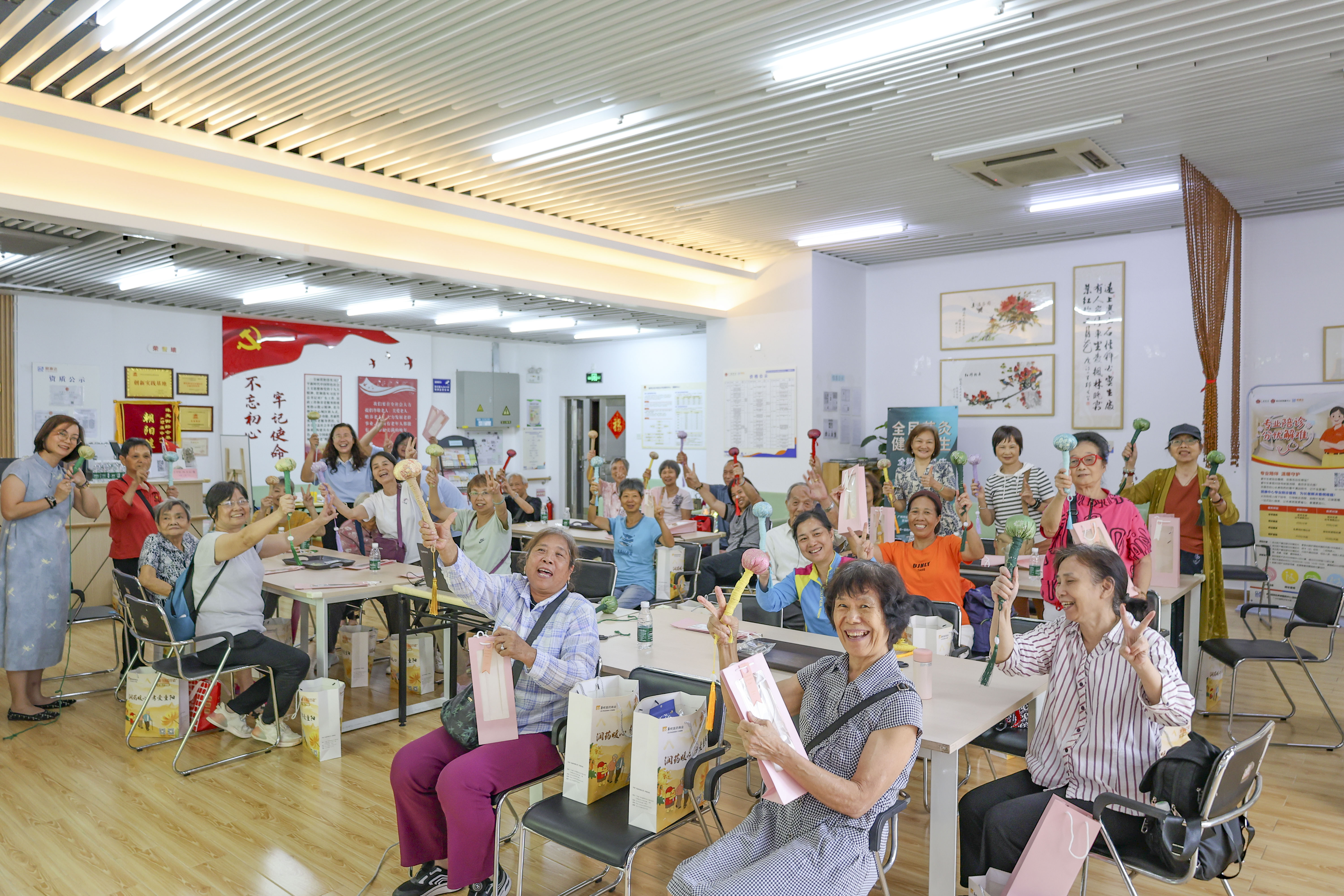 长者们共同参与体验了非遗手工——养生锤的制作活动,认真聆听讲解,动手体验传统技艺,现场气氛温馨融洽。志愿者们还为社区居民送上了重阳节暖心礼包与节日祝福,传递企业的关怀与温暖。