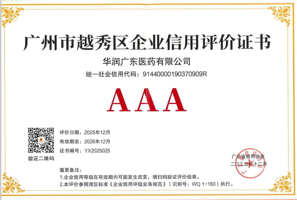 该项评级根据广州市越秀区信用企业、信用楼宇评价(2025年)工作安排,由广东省信用协会依据《企业信用评级业务规范》组织开展。华润广东医药获此殊荣,是公司近年来不断增强诚信守法与合规经营意识,敬畏法纪,信守承诺的有力印证。