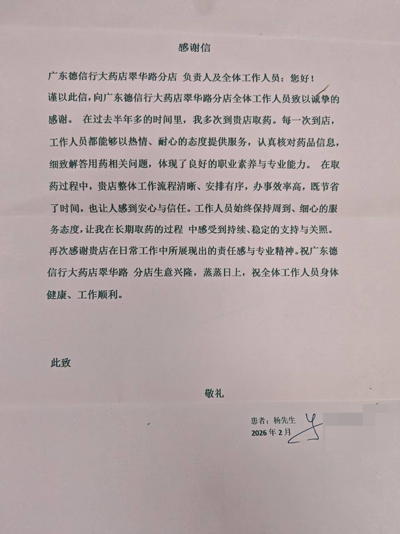 近日,华润德信行医药(广东)有限公司翠华路分店(曾用名:广东德信行大药房连锁有限公司翠华路分店)收到一份特殊的“礼物”——一面由顾客亲手赠送的锦旗与感谢信。锦旗上“心系客户、服务周到、高效优质、专业信赖”十二个大字,不仅承载着患者最真挚的谢意,更彰显翠华路分店全体药师扎实的专业素养与暖心服务。